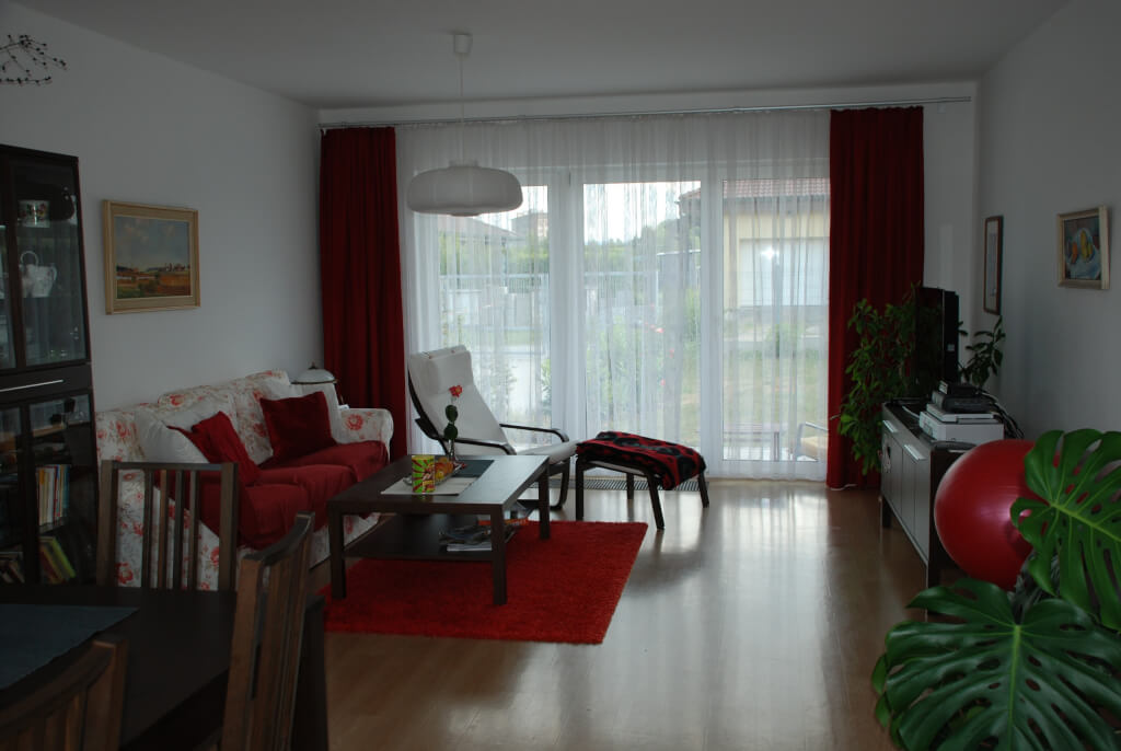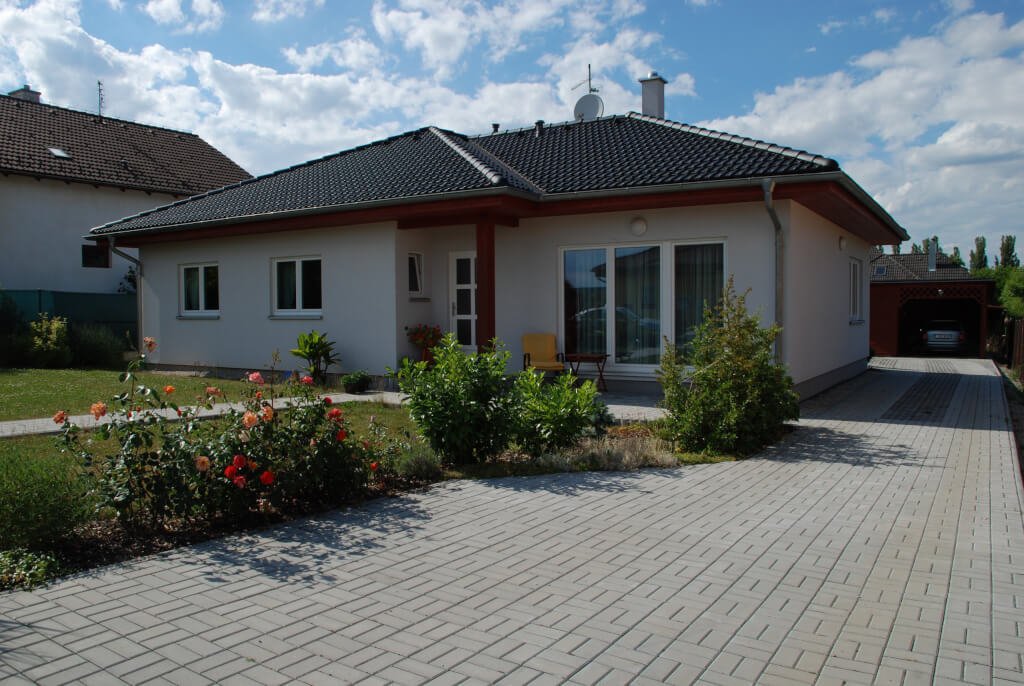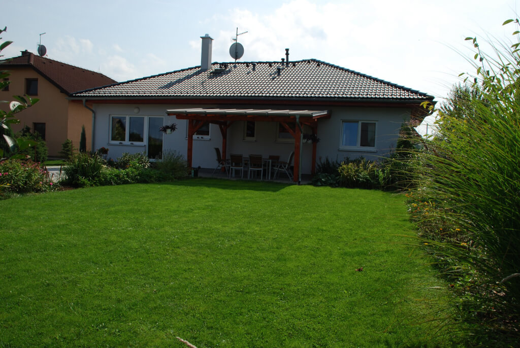 Majitelka zde nechala přistavět zastřešenou pergolu, která má výhodu v tom, že pod ní může být sezení umístěno trvale. Zároveň vytvořila přirozené překlenutí mezi interiérem a zahradou. Dnes tedy orientaci pozemku považuje spíše za klad, klidná ulice navíc umožnila otevřít bydlení do přední části zahrady. Obavy z chladu ale nemusely majitelku trápit, co se týče samotné stavby. Jedná se o kvalitně provedenou konstrukci dřevostavby s tzv. instalační předstěnou, za použití sendvičových panelů na bázi dřeva. Namísto původně navržených plastových oken s dvojskly nabídlo ATRIUM osazení trojskly. Dům splňuje parametry nízkoenergetické stavby a jeho vytápění plynovým kotlem majitelku nepřijde dráž než vytápění předchozího bytu.