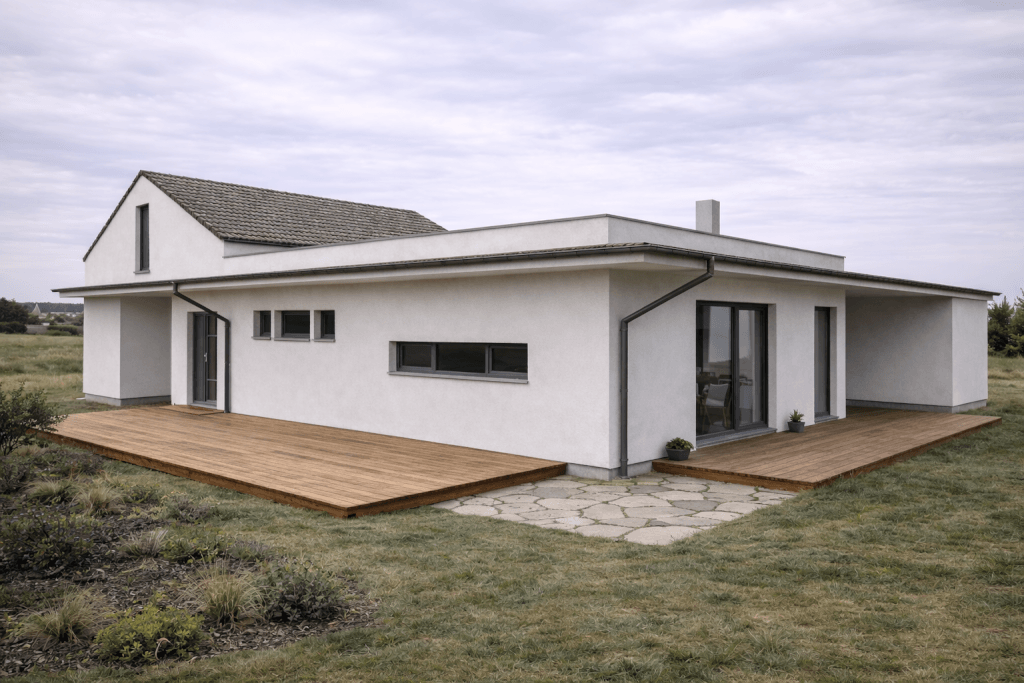 Od 15.04.2026 začínáme s montáží přízemního domu o velikosti 200 m2s individuálními úpravami v okrese Šumperk. Rodinný dům upravujeme na míru. Dům stavíme v difuzně otevřené konstrukci DIFUTECH® v dokončenosti stavba ALL INCLUSIVE.