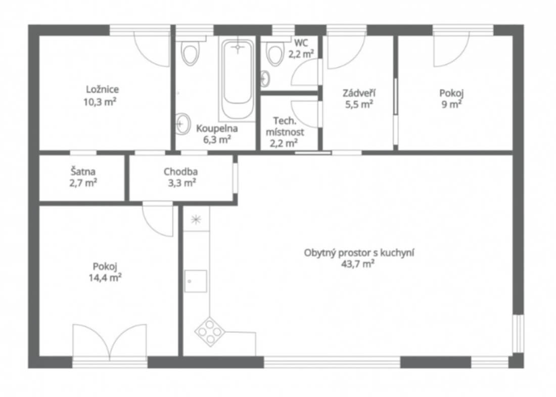 Po vstupu do přízemního rodinného domu (4+kk) se ocitnete v prostorné předsíni, odkud vedou dveře na samostatné WC, do technické místnosti, do pracovny a do hlavní obytné místnosti. Obytný prostor zaujímá až 43,7 m2 a spojuje kuchyni, jídelnu i samotný obývací pokoj, jehož dominantou jsou překrásná krbová kamna. Odtud se můžete vydat na venkovní terasu nebo do navazující menší chodby. Zde jsou navržené tři vstupy – do koupelny, pokoje pro hosty a do ložnice se šatnou.