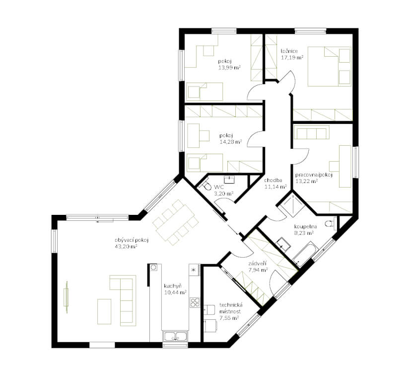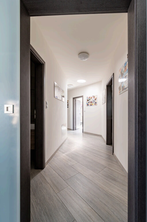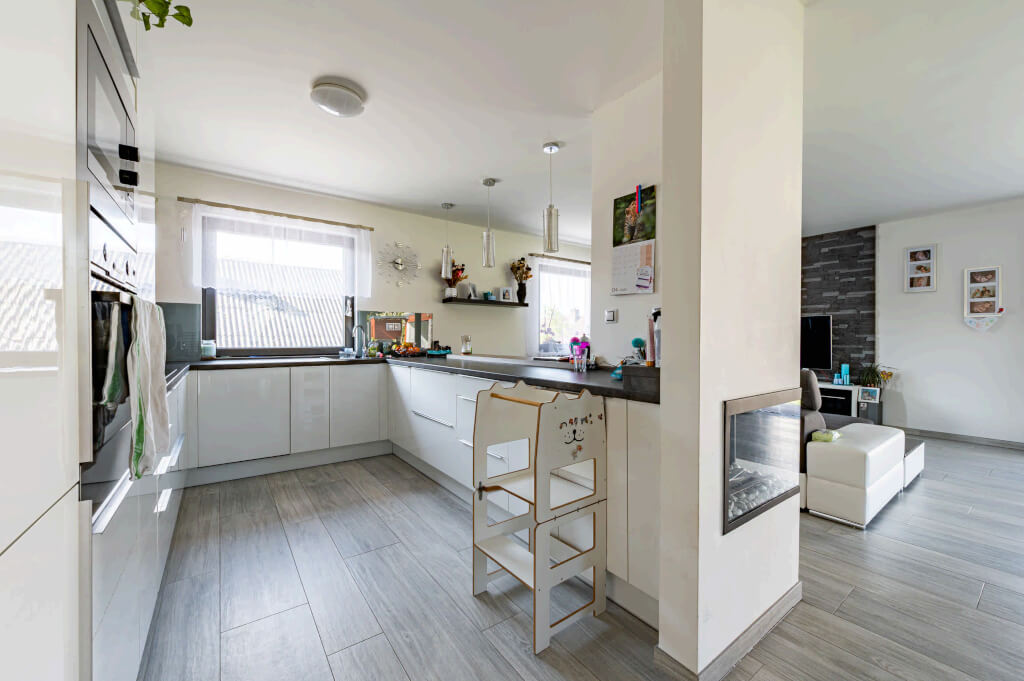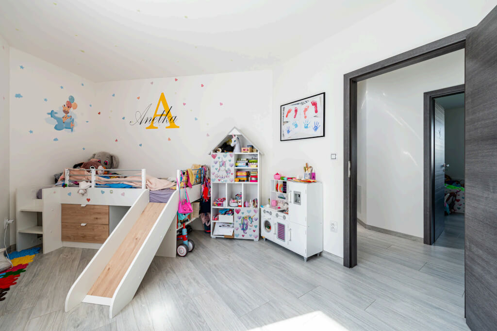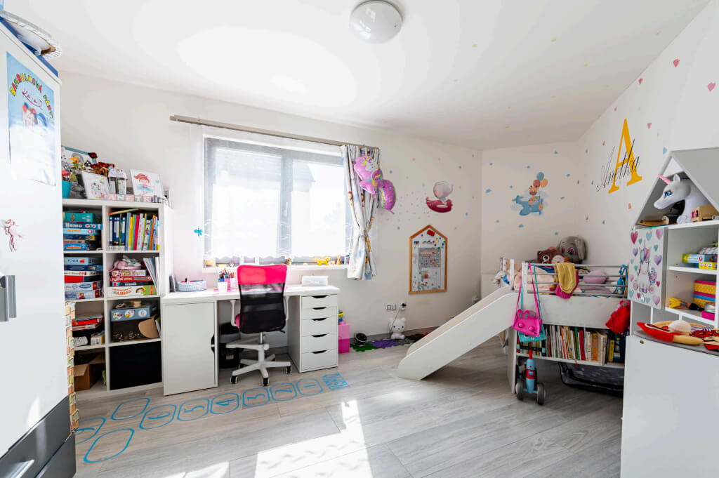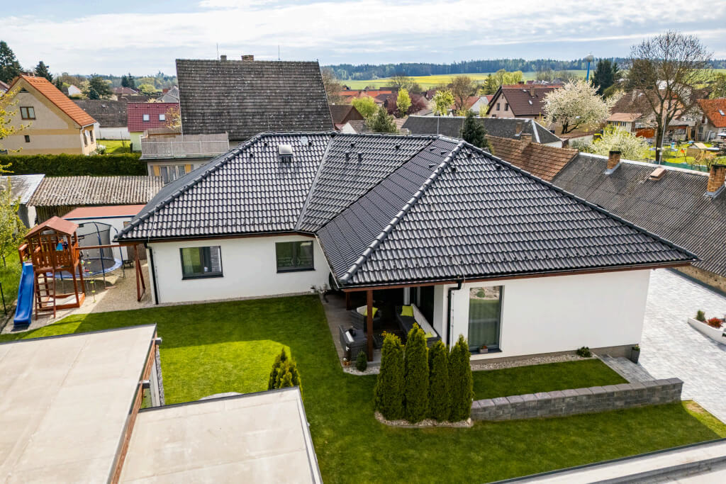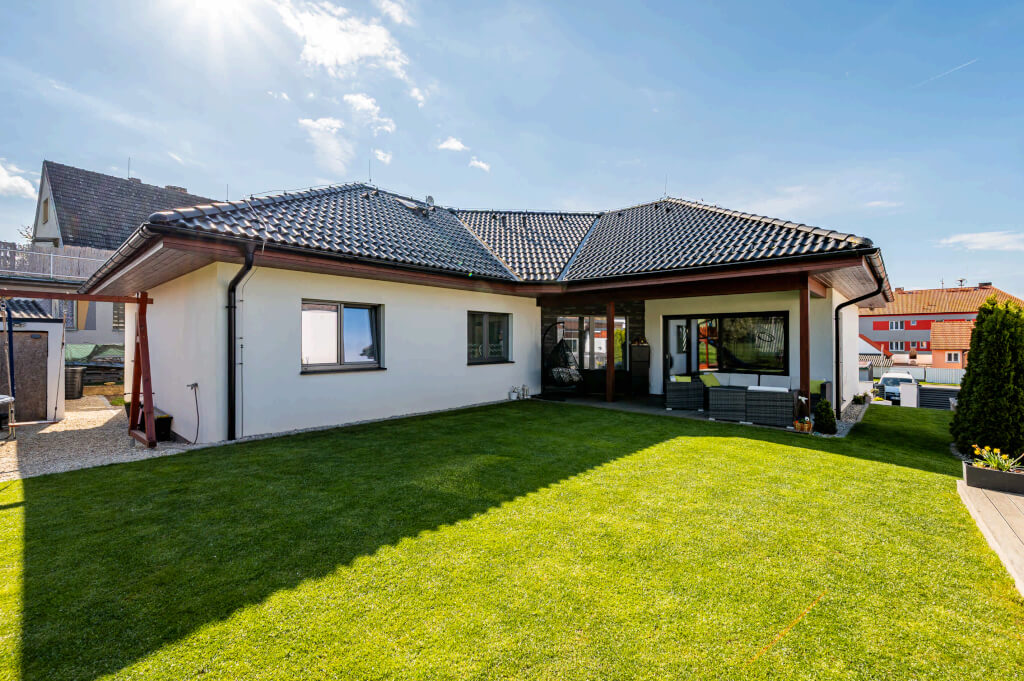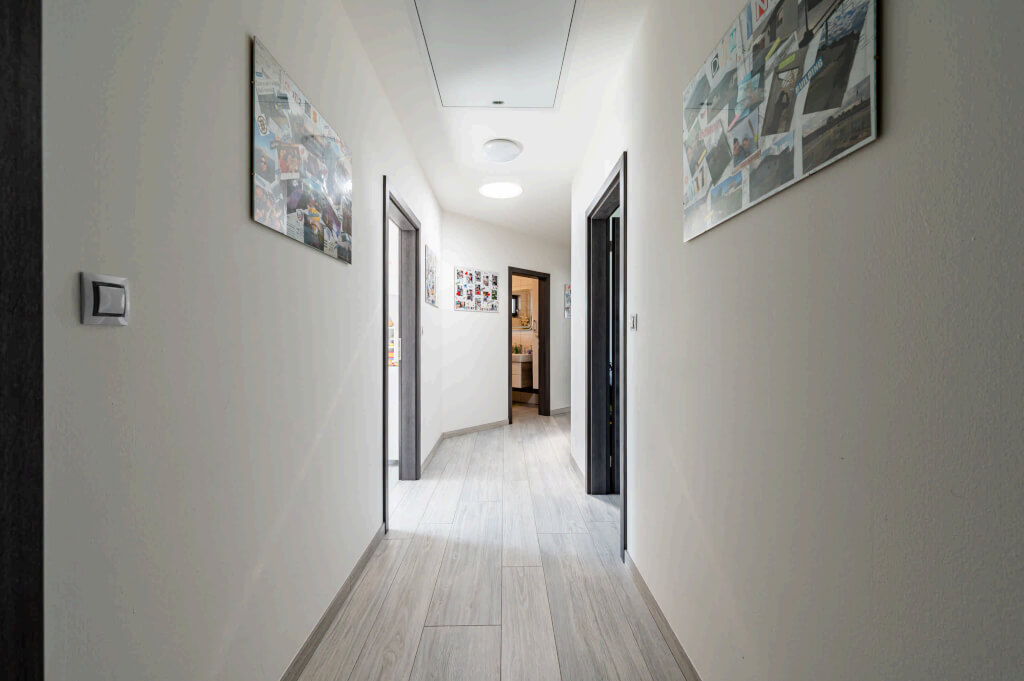„Chtěli jsme větší obývák, ložnici, pokoje pro děti a dvě pracovny, abychom měli všichni dostatek prostoru. Zároveň jsme uvažovali o tom, že jedno z našich dětí by u nás mohlo zůstat i v dospělosti, takže jsme v blízkosti šatny připravili prostor na schodiště a počítali s úpravou půdy na další bytovou jednotku,“ vysvětluje pan Jan. V praxi to znamenalo realizaci valbového krovu, aby byl v půdním prostoru dostatek místa.
