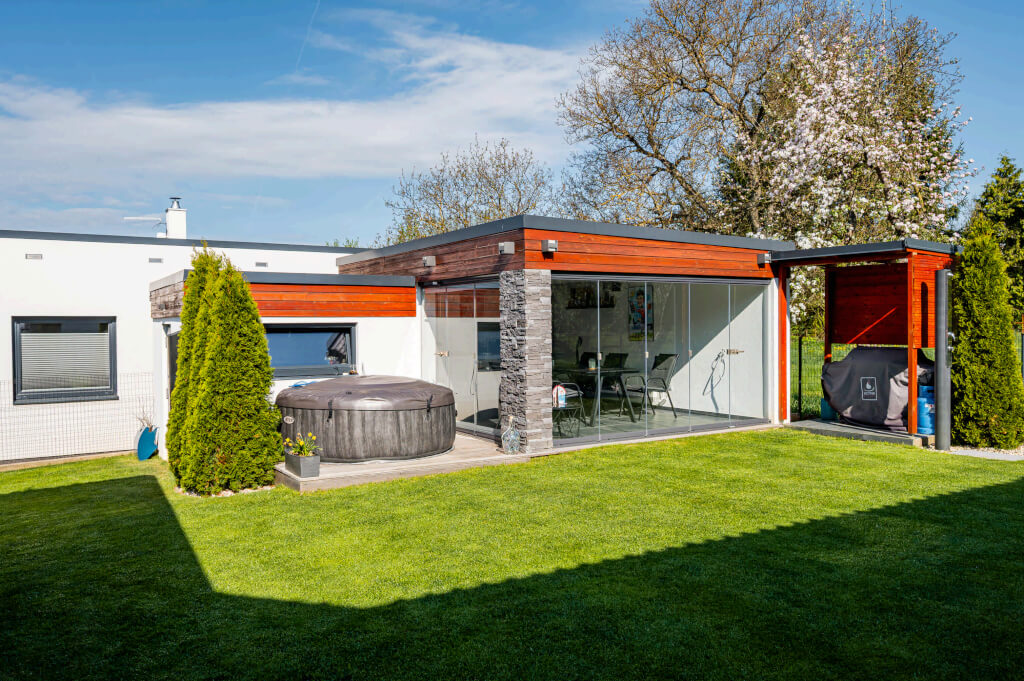 Když pan Jan mladší koupil stavební pozemek v blízkém sousedství rodičů, dřevostavba upraveného typového projektu domu Merkur pro pana Jana mladšího se mohla začít realizovat. Stavba nového domu započala v roce 2017, dřevostavba má difuzně otevřenou konstrukci, tepelné čerpadlo, podlahové topení, fotovoltaiku i bio krb. Prosklená terasa s posuvnými dveřmi umožňuje celoroční využití.