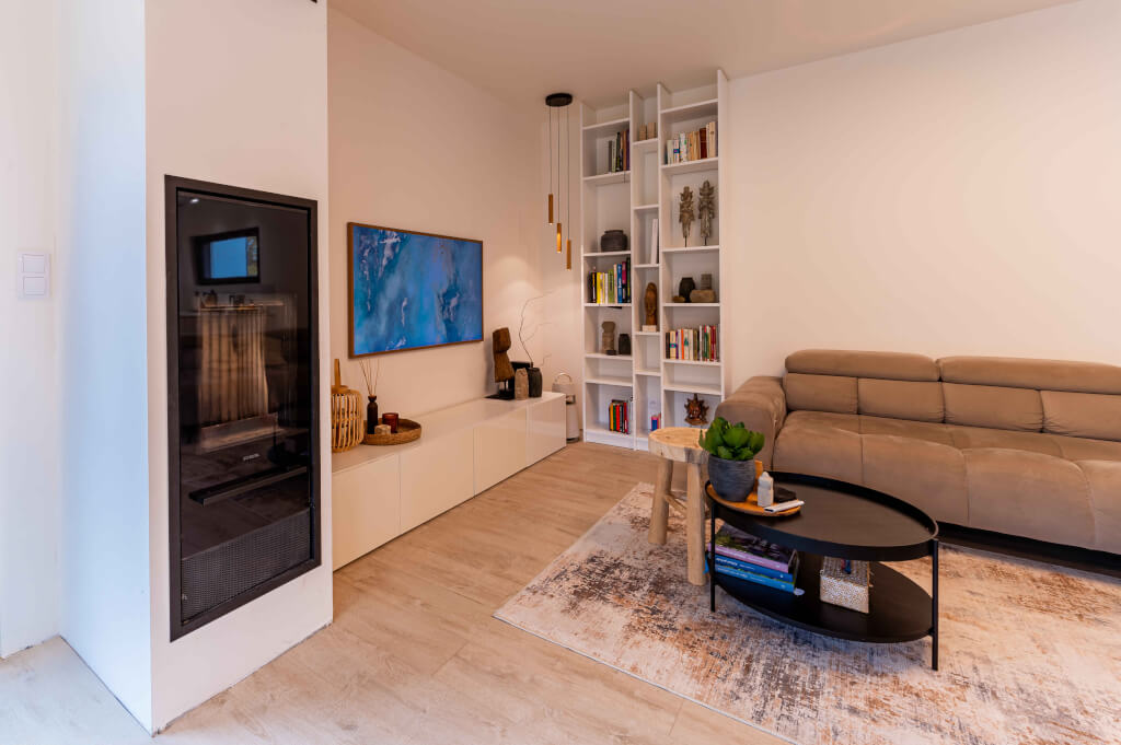 Vytápění: elektrické podlahové vytápění, fotovoltaický systém s akumulací do baterií, krbová kamna