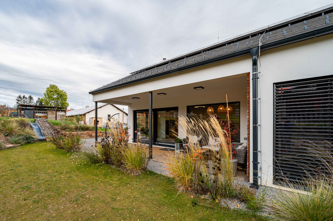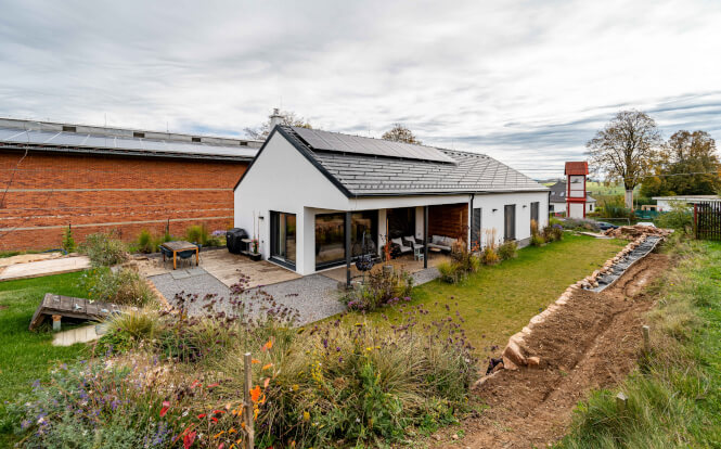 V červnu 2022 bylo konečně hotovo a rodina se mohla přestěhovat. Svůj domov si ani po třech letech nemohou vynachválit, i když je občas potrápí technologie. „Kromě podlahového topení máme ještě fotovoltaiku na střeše a dvě retenční nádrže, tepelné čerpadlo ani rekuperaci jsme nechtěli,“ vrtí hlavou Petr. Energie vyrobená fotovoltaikou slouží čistě k vlastní spotřebě, čímž pomohla výrazně snížit náklady na elektřinu. Dnes by jen místo výkonu 5 kW volili jednou tolik, také za dobu používání museli vyměnit porouchaný střídač.