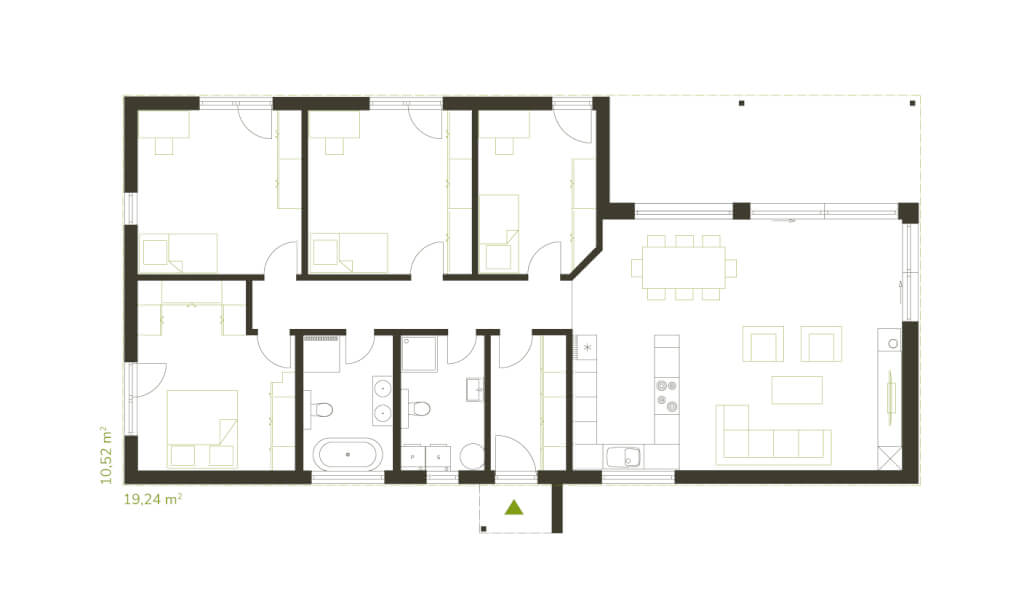Z nabídky dodavatele si proto vybrali jeden z přízemních typových domů, provedli na něm ale několik úprav. První z nich představovala změna pozice hlavního vchodu. „Původně měl mířit zepředu do ulice, ale mně to tam prostě nesedělo,“ říká Šárka. „Chtěli jsme ho dát z boku a zástupkyně firmy to vymyslela úplně skvěle.“ Změna čekala i vnitřní dispozici. „Typový dům Pollux měl pouze tři ložnice a my jsme pro jistotu chtěli ještě jednu místnost. A hlavně jsme potřebovali dvě koupelny, abychom se mohli všichni v klidu umýt,“ navazuje na ni Petr. Jednu samostatnou koupelnu proto doplňuje sprchový kout umístěný v technické místnosti.