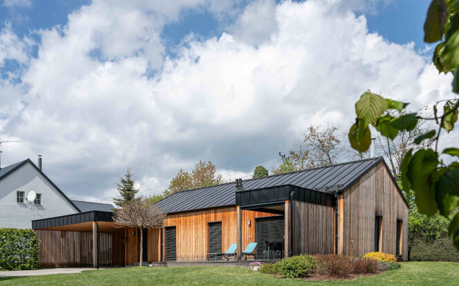 Při plánování domu kladli s manželkou Nikolou důraz na to, aby dojem zůstával stejný i po průchodu brankou. Hned za ní se vám naskytne pohled na sladěný domek, jehož obložení je stejně jako ostatní zařízení (nejen plot, ale i terasa včetně sloupů či přístřešky) vyrobeno ze sibiřského modřínu. „Mohli jsme to nechat udělat třeba ze smrku a každé dva roky to natírat. Ale my jsme se rozhodli pro dražší variantu s vyšší životností než u našich dřevin. Přiznávám, bylo to i z lenosti – sibiřský modřín totiž můžeme nechat zrát a přirozeně stárnout a časem se při pohledu z ulice vše sjednotí.“