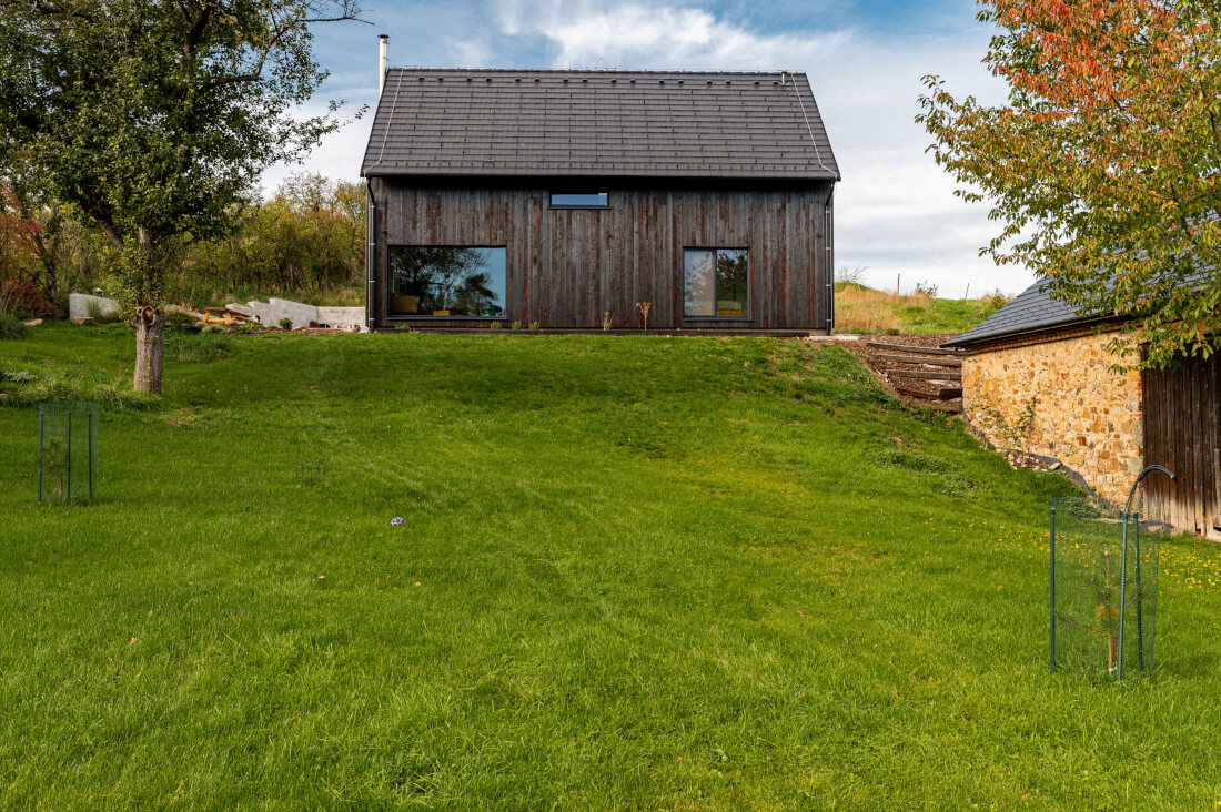 Opět bych řekla, že jsme nenechali nic náhodě a ohledně opalované fasády si nastudovali hodně materiálů, přesto se realizace nepovedla zcela bez výhrad. Sibiřský modřín včetně jeho opálení jsme si nakonec objednali u jedné mostecké firmy, která nás pozvala i do výroby, abychom se ohledně stupně opálení i případného kartáčování opáleného povrchu mohli rozhodovat na základě reálných vzorků, a my jsme tak zvolili intenzivní tepelnou úpravu se zuhelnatělou vrstvou na povrchu bez kartáčování (tzv. krokodýlí kůže). Ukazovali nám i různé způsoby kotvení a nám se zalíbilo kotvení skryté, kde jsou jediné viditelné vruty na fasádě ve spodní části, jinak jsou prkna chycená plíšky na perkách. Ujistili nás, že dodané dřevo bude dostatečně stabilizované a vysušené, aby docházelo k minimálnímu kroucení a deformacím. Realizaci jsme svěřili místní firmě, která se nám osvědčila při opravě stodoly, za týden od dodání prken bylo hotovo.