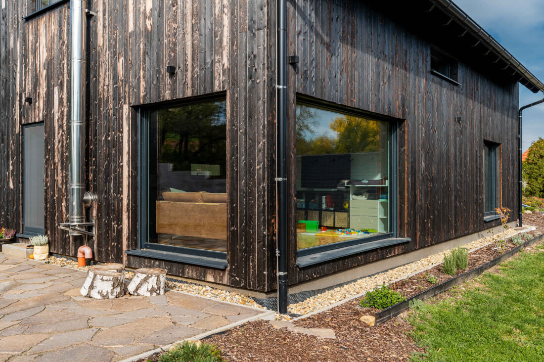 Lehké problémy ale nastaly v průběhu používání – na jihozápadní fasádě, která je nejvíc namáhaná deštěm a sluncem, a navíc exponovaná ze strany pole, se některá prkna kroutí a perka vyskakují. Manžel tedy jednou za čas vytáhne žebřík a palubky, které povyskočily, „zacvaká“ zpátky. Můžeme jen hádat, kde se stala chyba. Možná bylo dřevo nedostatečně vysušené, možná měla realizační firma zkušenost s dřevěnými palubkami, ale opalovaná fasáda se chová jinak a praxi s takovým materiálem má v ČR bohužel málokdo. Možná je nevhodný systém skrytého kotvení. Každopádně, první rok se to stávalo poměrně často, ten druhý už výrazně méně, takže si říkáme, že až se obklad úplně stabilizuje, bude to snad v pořádku. Jinak jsme ale s opalovanou fasádou moc spokojení. Baví nás, jak na různých světových stranách různě zraje, jak je někde stále patrnější struktura dřeva, skoro jako kdyby byla prkna vykartáčovaná, a jinde se černá barva zase vůbec nemění. Návštěvy nám pořád dům „osahávají“ a ptají se, zda špiní. Ano, špiní, respektive špinil, zkrátka jako když sáhnete na uhlí. Ale jak jde čas, už to rozhodně není tak intenzivní.
