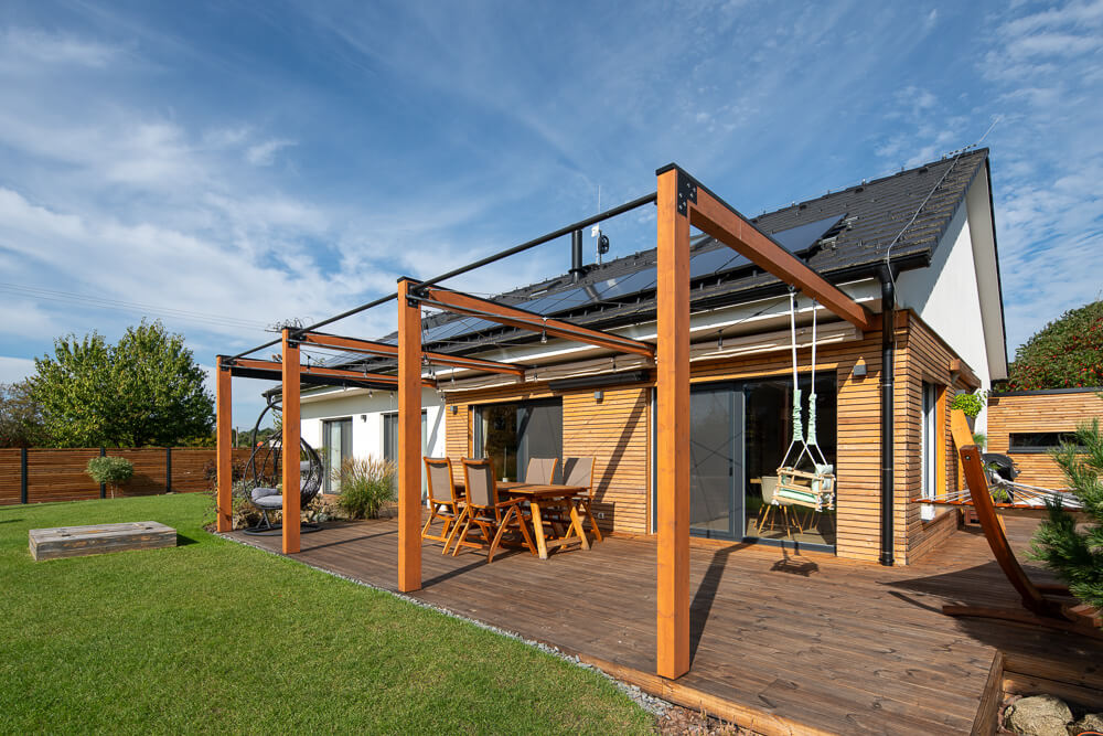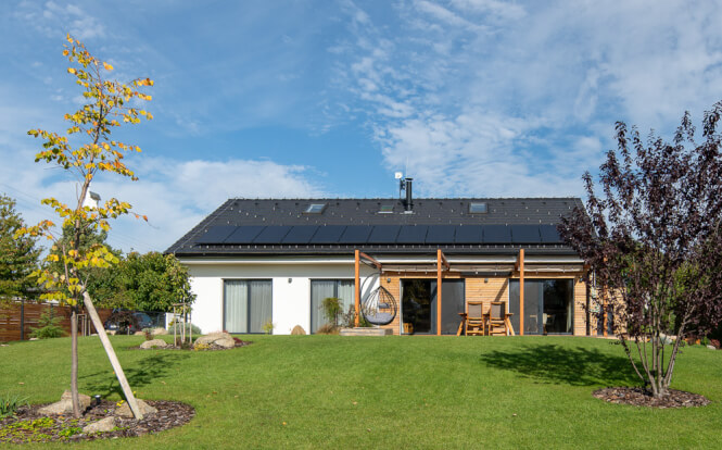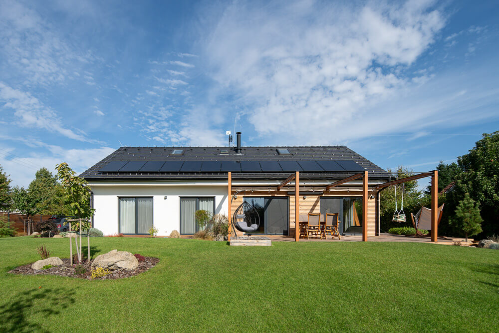 V celém domě máme podlahové teplovodní vytápění s teplotou nastavenou o dva stupně nižší, než je obvyklé, protože ten zbytek dotápí vzduchotechnika. Je to prý energeticky efektivnější, než maximalizovat výkon elektrokotle, který ohřívá vodu do topení. Jinak jsme si nechali od ATRIA udělat přípravu na fotovoltaiku a dodělávali jsme ji už svépomocí. Pokryje nám zhruba třetinu spotřeby, která činní 12 MWh.