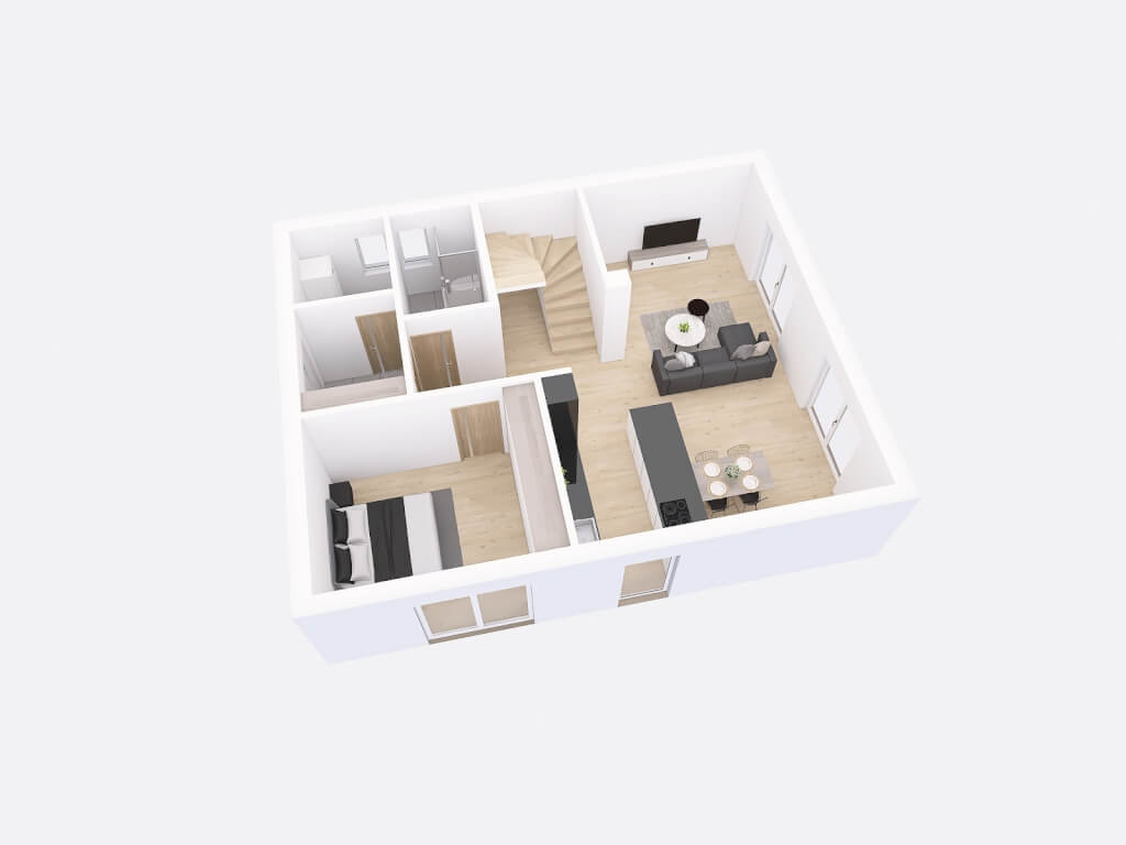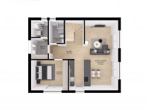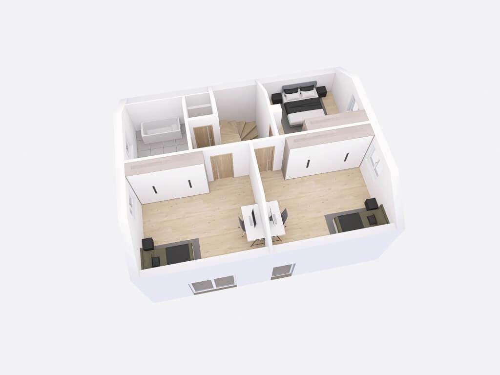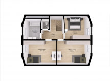 Dům má půdorys ve tvaru obdélníku o rozměrech 10,68 x 8,68 m. Interiér má promyšlené dispoziční rozdělení domu na společenskou a klidovou. Nevyhovujeme vám půdorysné řešení? Upravíme celý dům podle vašeho přání.