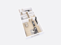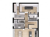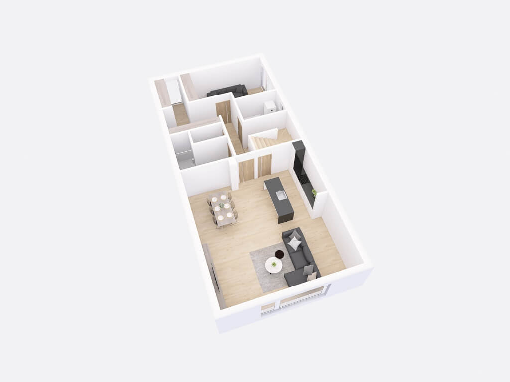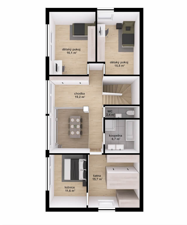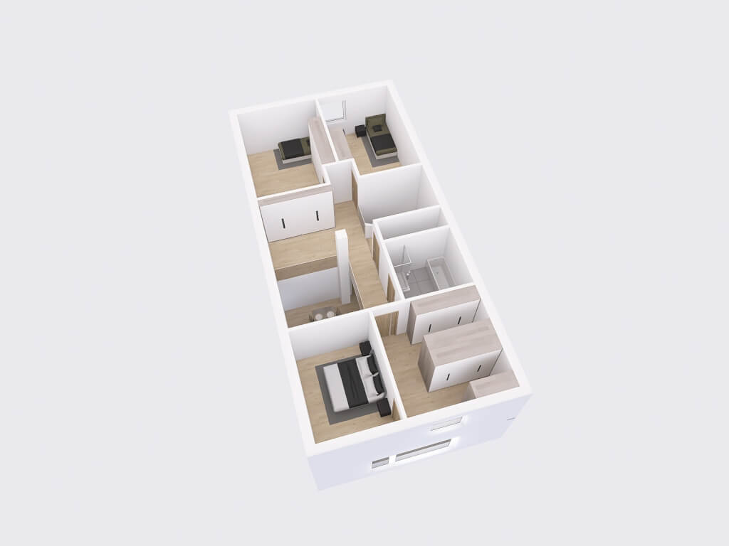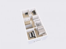 Dům má obdélníkový půdorys o rozměrech 7,6 x 15,7 m. Interiér má promyšlené dispoziční rozdělení domu na společenskou a klidovou část. Nevyhovujeme vám půdorysné řešení? Upravíme celý dům podle vašeho přání.