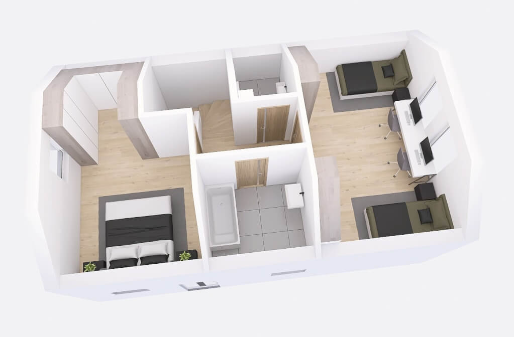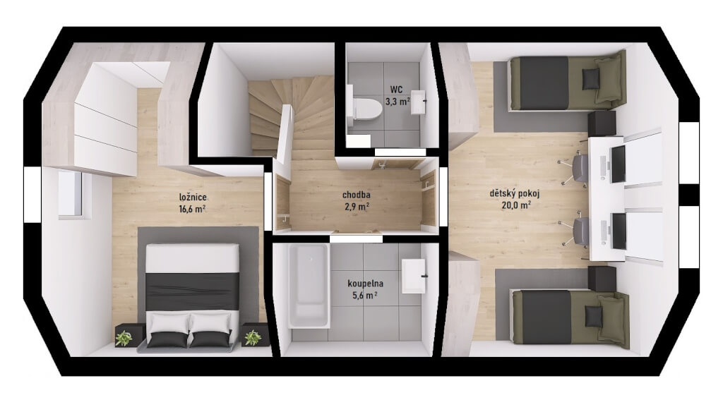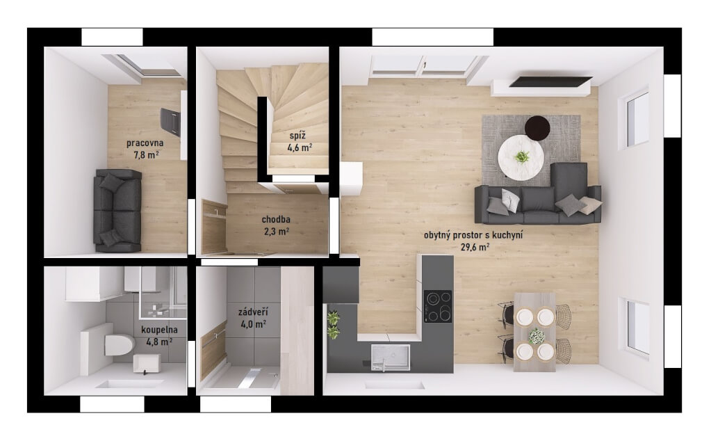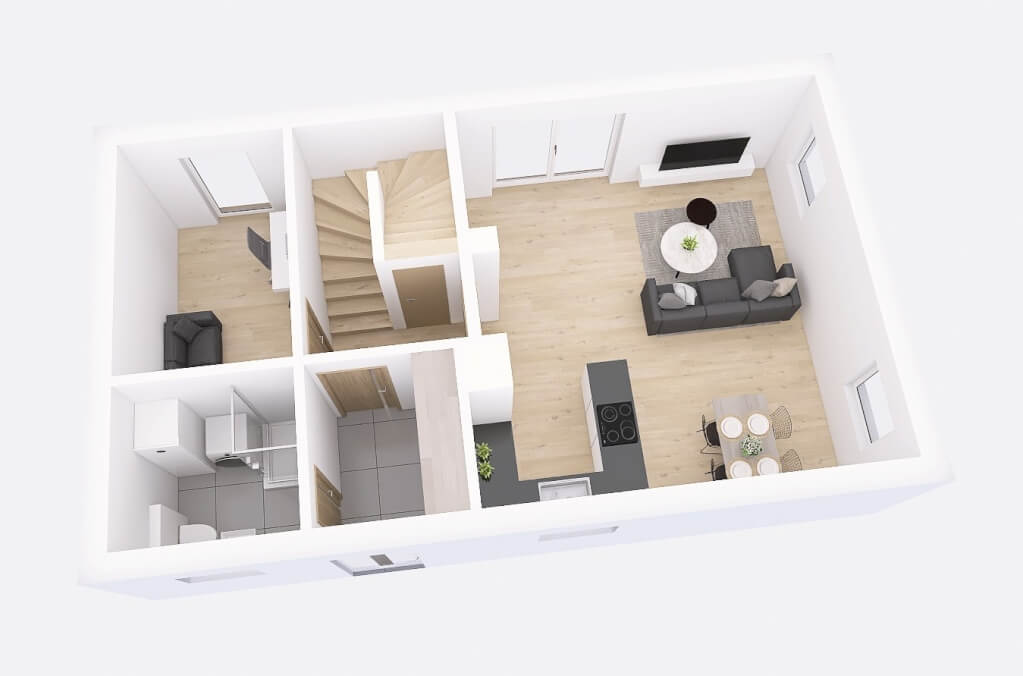 Dům má půdorys ve tvaru obdélníku o rozměrech 10,60 x 6,28 m. Interiér má promyšlené dispoziční rozdělení domu na společenskou a klidovou část. Nevyhovujeme vám půdorysné řešení? Upravíme celý dům podle vašeho přání.