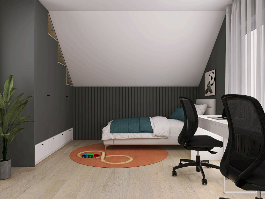 Máte úzký pozemek? Dům Jubileum Profi 102 je pro něj stvořený. Obývací pokoj s kuchyní a malou koupelnou tvoří přízemí domu. Vyšší sklon střechy umožňuje lepší využití plochy v podkrovních místnostech. V podkroví jsou dvě velké ložnice, dvě šatny a koupelna. Z obývacího pokoje pohodlně vyjdete ven na terasu s výhledem do zahrady.