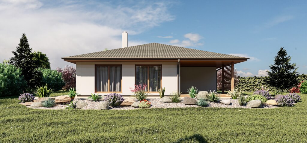 Menší bungalov Nova 103 je vhodný pro čtyřčlennou rodinu. Tyto rodinné domy jsou velmi oblíbené. Ale žádný není na 100 % stejný. Každý realizovaný bungalov Nova je jiný, ať svou venkovní podobou nebo vnitřním uspořádáním. Je příjemné sedět v obývacím pokoji a pozorovat velkými prosklenými okny měnící se přírodu. Pokud si dopřejete i krb, pak máte útulný domov zaručen! Zkuste na fasádu částečný dřevěný obklad a uvidíte, jak bude dům lahodit oku.