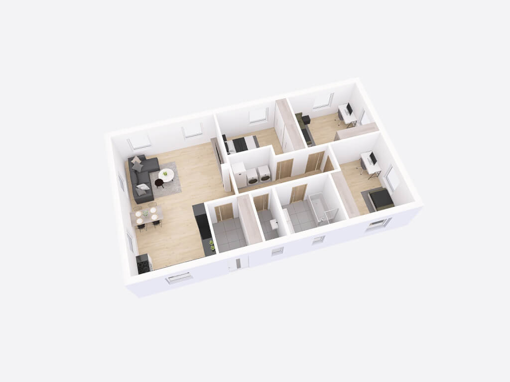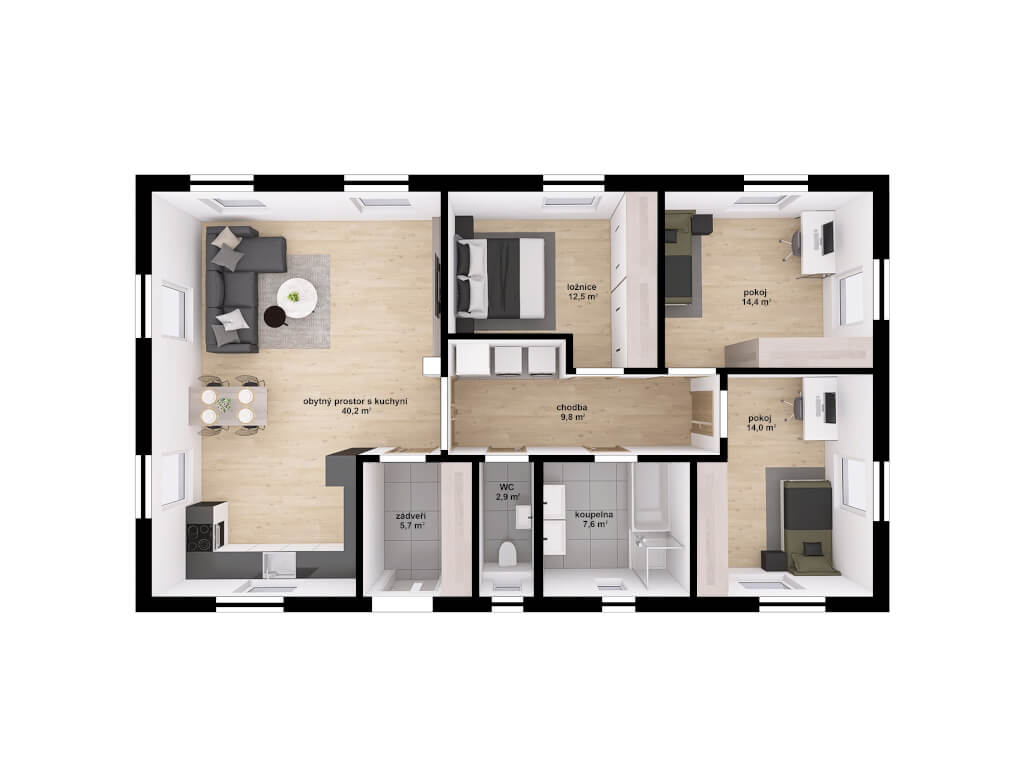 Dřevostavba 4+kk má obdélníkový půdorys o rozměrech 8,6 x 14,8 m. Interiér má promyšlené dispoziční rozdělení domu na společenskou a klidovou. Nevyhovujeme vám půdorysné řešení? Upravíme celý dům podle vašeho přání.