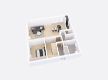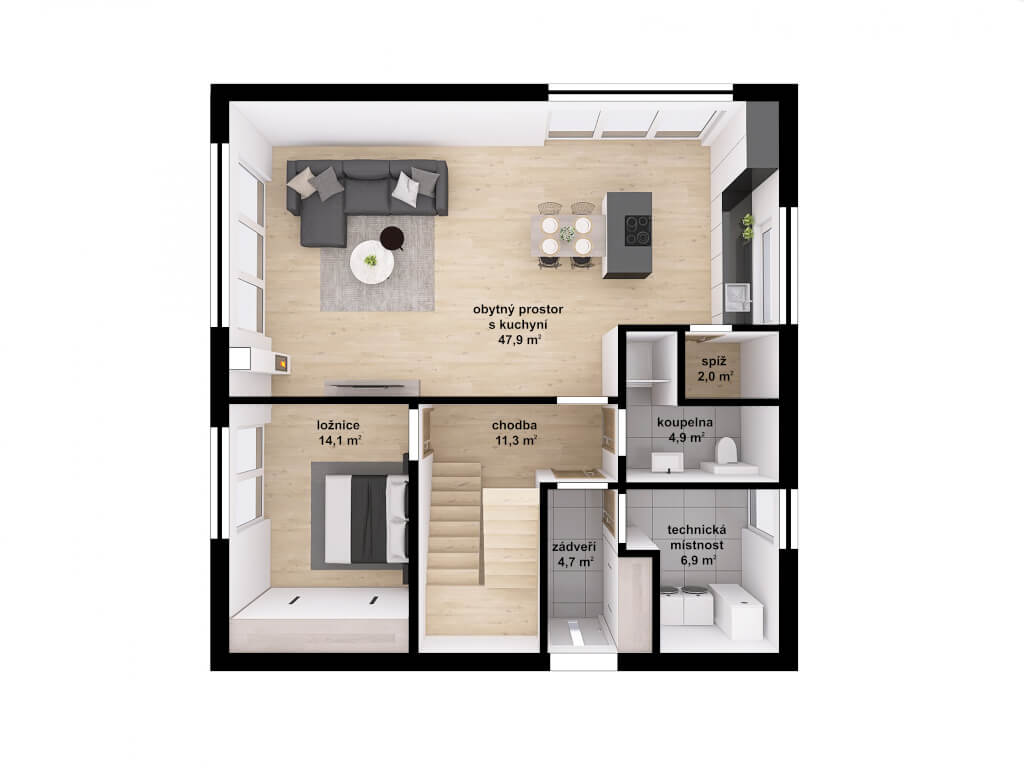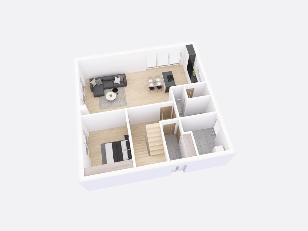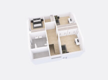 Dům má čtvercový půdorys o rozměrech 10,47 x 10,47 m. Interiér má promyšlené dispoziční rozdělení domu na společenskou a klidovou část. Nevyhovujeme vám půdorysné řešení? Upravíme celý dům podle vašeho přání.