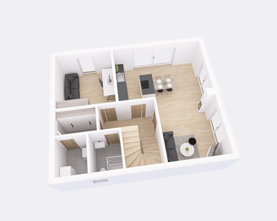 Patrový dům má obdélníkový půdorys o rozměrech 8,54 x 10,24 m. Interiér má promyšlené dispoziční rozdělení domu na společenskou a klidovou. Nevyhovujeme vám půdorysné řešení? Upravíme celý dům podle vašeho přání.
