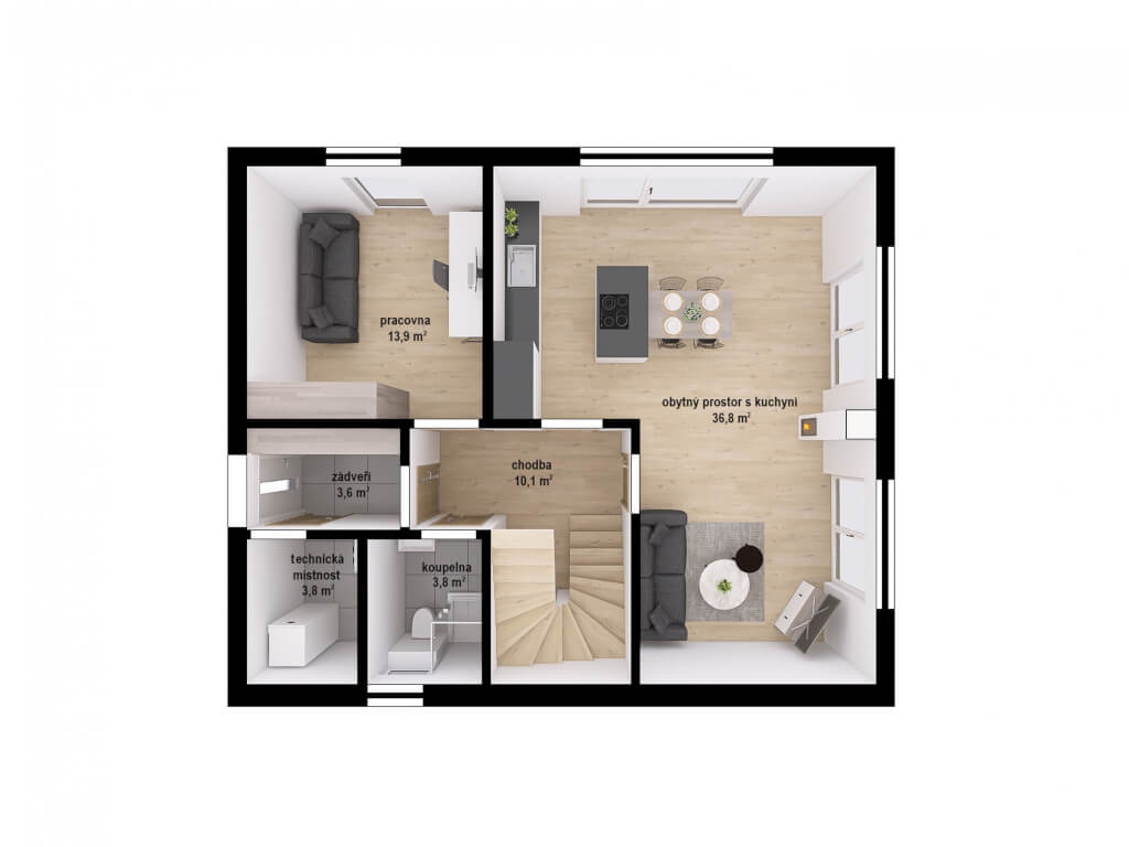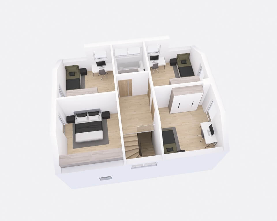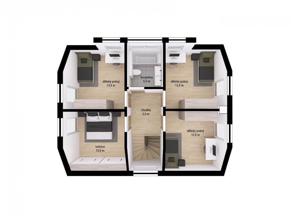 Patrový rodinný dům Variant 139 je svým nadčasovým vzhledem stále moderní. K domu si můžete dodělat pergolu a využít průchod z obývacího pokoje například na vychutnání ranní kávy. Pokoj v přízemí poslouží jako pracovna, pokoj pro hosty nebo jako odpočinková místnost, to už záleží na vás. V podkroví domu se nachází čtyři velké pokoje a koupelna.